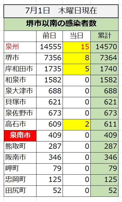 新型コロナ感染状況 堺市以南 2021年7月1日
