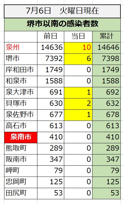 新型コロナ感染状況 堺市以南 2021年7月6日分