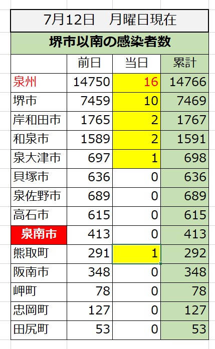 新型コロナ感染状況 堺市以南 2021年7月12日