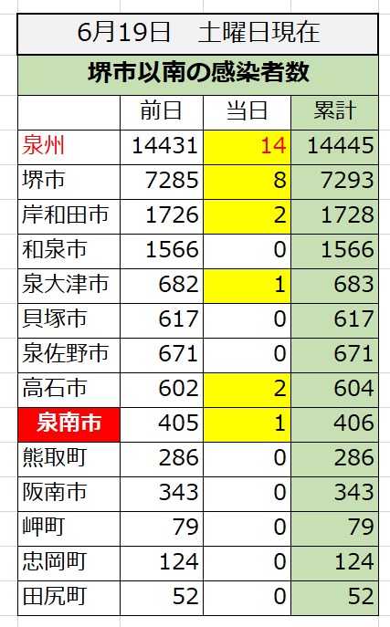新型コロナ感染状況 堺市以南 2021年6月19日土曜日