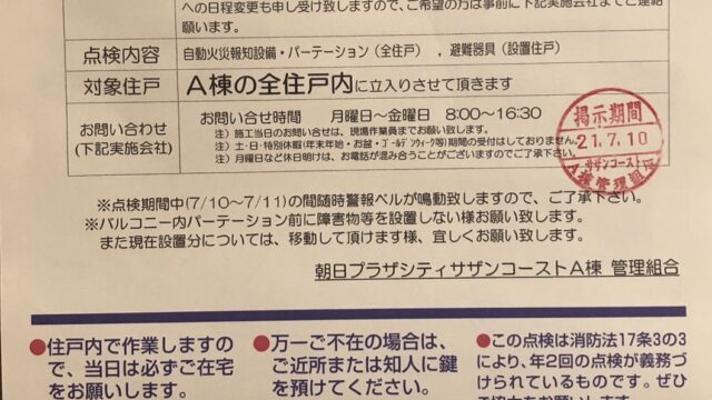 7月10日 消防設備点検のお知らせです