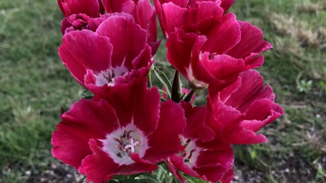 ロボットゲート横の提供公園で赤い花が沢山咲いてます。